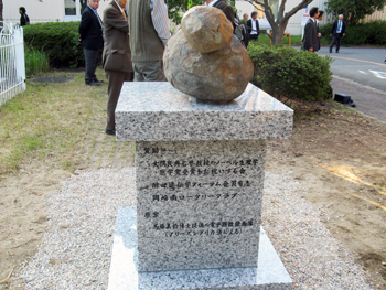 モニュメントは石造で、大隅先生の研究対象である酵母をモチーフとしたものです。原案の酵母写真は、馬場美鈴総合研究所研究員がフリーズレプリカ法で撮影した電子顕微鏡写真であることから、馬場研究員は除幕式に招待され、出席しました。