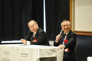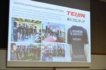 開催初日(11月1日)の9時40分より総合教育棟1N-338教室で開始された最初の基調講演では、本学名誉博士で2010年にノーベル化学賞を受賞された根岸英一先生(アメリカ・Purdue大学特別教授/帝人グループ名誉フェロー)、ソーラーチームのサポート企業である帝人株式会社より梅谷博之氏(帝人グループ執行役員/帝人株式会社 マテリアル技術本部長)、佐藤光史学長、濱根洋人准教授(ソーラーチーム監督/工学部 機械システム工学科)が登壇し、10月にオーストラリアで開催されたソーラーカーの世界大会に参戦し、豪大陸3,021kmを完走したソーラーチームをテーマにディスカッションを行いました。