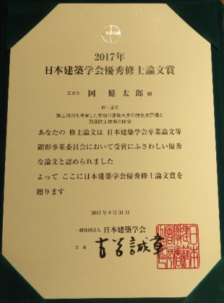 2017年8月31日に開催された日本建築学会において、2016年度建築学専攻2年(田村研究室)岡 健太郎さんが「施工状態を考慮した木摺漆喰天井の健全度評価と剥落防止技術の開発」と題する研究発表で、2017年 日本建築学会 優秀修士論文賞を受賞しました。(岡 健太郎さんは2017年3月修了生で、当時の修士論文が今回表彰されました。)