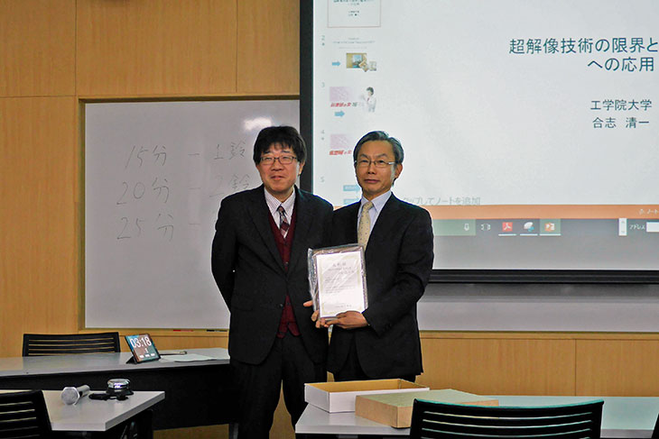 通信方式研究会は、1年に6回開催され、伝送関係の専門家が研究成果を発表する研究会です。通信方式研究会委員長賞は、1年間に行われた研究発表の中で最も優れた発表1件だけに授与される賞です。今回の受賞は富士通(株)との共同研究で実用化した超解像機能搭載スマートフォンの研究に対して授与されました。