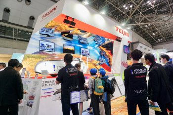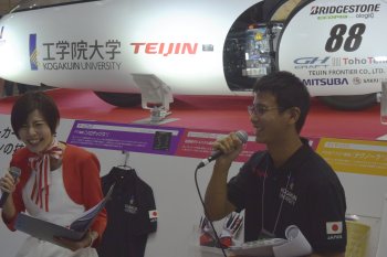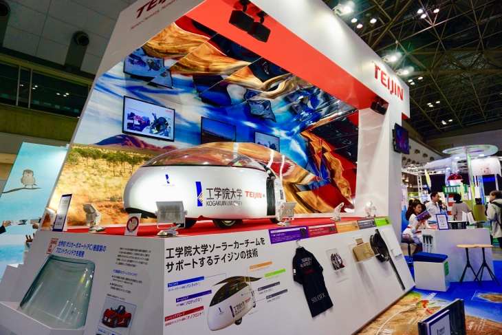 また、今年の10月にオーストラリアで開催された世界最大級のソーラーカーレースに参戦し、ソーラーチームの学生たちが製作した最新車両が、帝人グループのブースに展示されています。壇上でライトアップされた車両「Wing」は、通り過ぎる来場者も足を止めてじっと見つめるほど注目度が高く、説明員としてブースに立つ学生メンバーに問いかける姿が多く見られました。