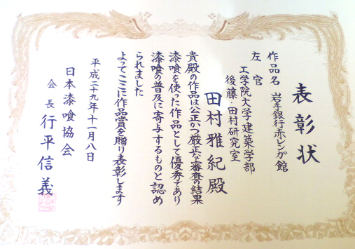 後藤治研究室(建築デザイン学科)・田村雅紀研究室(建築学科)が、2017年11月8日に熊本(ホテルメルパルク熊本)にて,第12回日本漆喰協会作品賞を授与されました。