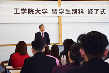 初めに、佐藤学長からの式辞があり、慣れない日本での生活や学びに努めてきた修了生へのねぎらいとはなむけの言葉が贈られました。