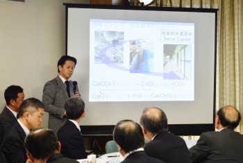 田村教授は、漆喰の原料となる3億年前の石灰石を持参し、珊瑚由来の純国産素材で、吸湿性、吸臭性、ホルムアルデヒドの除去等の快適性に優れる等の研究報告を行いました。