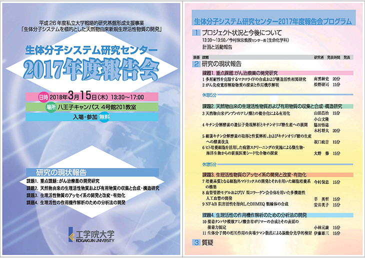 3月15日、工学院大学総合研究所生体分子システム研究センター2017年度報告会を開催します。