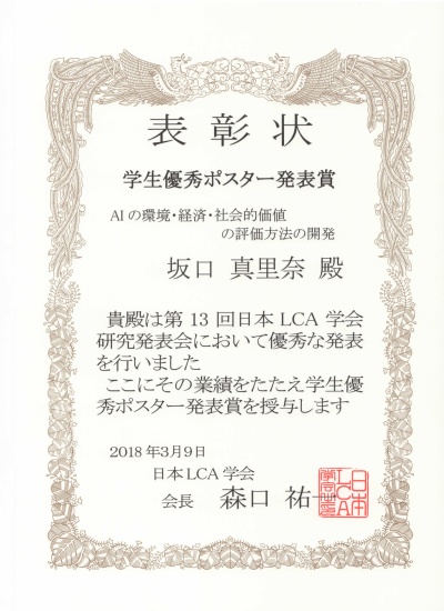 Home 2017年度のお知らせ 環境エネルギー化学科生が日本LCA学会において学生優秀ポスター発表賞を受賞 環境エネルギー化学科生が日本LCA学会において学生優秀ポスター発表賞を受賞 2018/03/16 シェアする 2018年3月8日に開催された日本LCA学会において、環境エネルギー化学科4年(環境マネジメント研究室)坂口真里奈さんが「AIの環境・経済・社会的価値の評価方法の開発」と題する研究発表で、学生優秀ポスター発表賞を受賞しました。 前へ 一覧に戻る 次へ