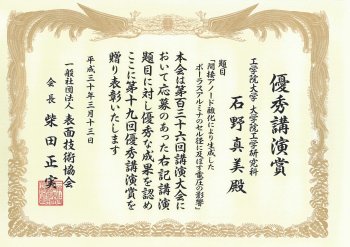 2017年9月15日に開催された一般社団法人表面技術協会第136回講演大会において、化学応用学専攻2年(無機表面化学研究室)石野真美さんが「間接アノード酸化により生成したポーラスアルミナのセル径に及ぼす電圧の影響」と題する研究発表で、一般社団法人表面技術協会第19回優秀講演賞を受賞しました。