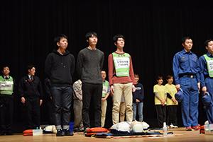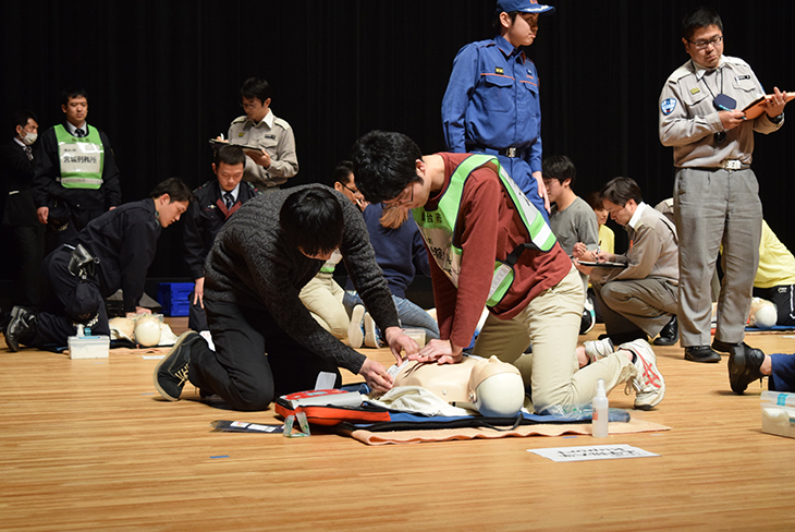 建築学部で学ぶ3年生3名で1チームとなり、同コンテスト「学生の部」に参加。一時救命処置、三角巾による傷病対応、防災クイズの総得点で争われました。
