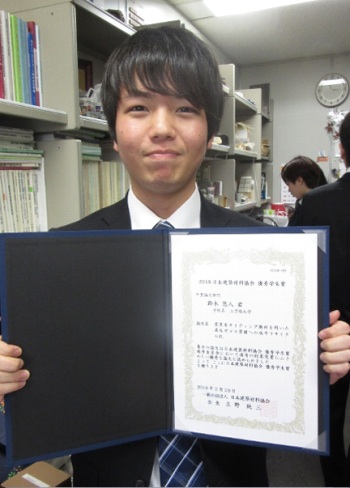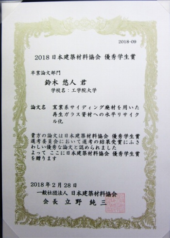 2018年2月28日に開催された一般社団法人日本建築材料協会において、建築学科4年(田村雅紀研究室)鈴木悠人さんが「窯業系サイディング廃材を用いた再生ガラス質系資材への水平リサイクル化」と題する研究発表で、2018年 一般社団法人日本建築材料協会 卒業論文部門優秀学生賞を受賞しました(受賞時は学部4年生)。