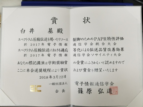 2017年9月12日~15日に開催された電子情報通学会において、電気・電子工学専攻生2年(アクセスネットワーク研究室)白井 基さんが「スペクトラム圧縮伝送における適応等化による伝送品質改善効果」と題する研究発表で、学術奨励賞を受賞しました。
