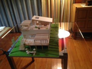 3月初旬に、ドラマ制作担当者から西森教授(建築学部建築デザイン学科)にお声がかかり、制作がスタートしました。依頼は模型一台でしたが、設計条件は「斜面に立ち、自然と共生するデザイン」と指定されただけ。全くプランの無い状態に加えて、この模型の設計図、3Dデータも模型と並行して制作することになりました。作業時間は、土日や卒業式を除くと実質5日間。そこで、5名は作業を分担して早速取りかかりました。ドラマは二人の建築家をめぐる設定のため、建築家が作る模型に見える高い質も欠かせません。5名はディスカッションを繰り返しながら、手を動かし続けました。