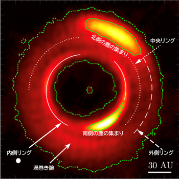 また、楕円形の穴の構造が見えたのはこの天体が初めてです。これらの構造は、円盤中に存在する惑星の影響といった、力学的な要因によって引き起こされている可能性があり、この天体は、円盤の中で惑星が作られている状況証拠を豊富に持った天体であることがわかりました。