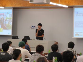 今年は「選ばれる団体としてのブランドづくり」をテーマに、学生自治会や新聞会、ソーラーチームの学生たちが講師役となり研修を行いました。学生団体のブランドづくりについて、国内外の大会で輝かしい実績を残し、各種イベントに積極的に出展し、多数のメディア出演を果たすソーラーチームが、チームの運営体制や現状、世界大会に向けた取り組みについて映像等を交え講演しました。その後、グループにわかれ「各団体のブランドづくりを行うためのアイディア出し」について意見交換を行い、参加者全員で共有しました。