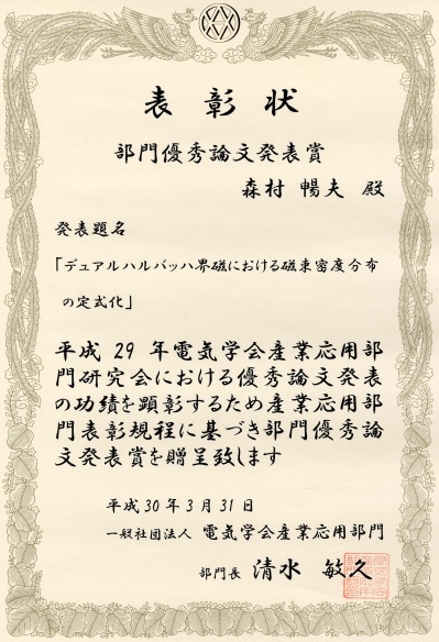 Home 2018年度のお知らせ 電気・電子工学専攻生が電気学会産業応用部門において優秀論文発表賞を受賞 電気・電子工学専攻生が電気学会産業応用部門において優秀論文発表賞を受賞 2018/09/12 シェアする 2017年6月23日に開催された電気学会産業応用部門大会において、電気・電子工学専攻博士課程2年(電磁力応用システム研究室)森村 暢夫さんが「デュアルハルバッハ界磁における磁束密度分布の定式化」と題する研究発表で、平成29年電気学会産業応用部門優秀論文発表賞を受賞しました。 電磁力応用システム研究室 前へ 一覧に戻る 次へ