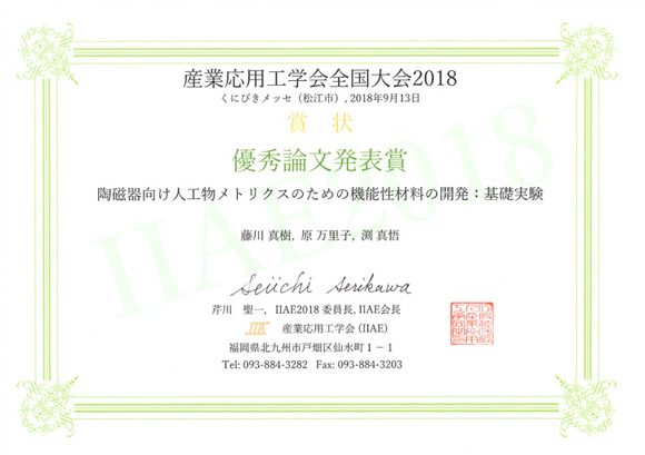 Home 2018年度のお知らせ コンピュータ科学科生が産業応用工学会全国大会2018において優秀論文発表賞を受賞 コンピュータ科学科生が産業応用工学会全国大会2018において優秀論文発表賞を受賞 2018/09/25 シェアする 2018年9月13日に開催された産業応用工学会全国大会2018において、コンピュータ科学科4年(セキュリティ科学研究室)原 万里子さんが「陶磁器向け人工物メトリクスのための機能性材料の開発:基礎実験」と題する研究発表で、優秀論文発表賞を受賞しました。 産業応用工学全国大会2018 セキュリティ科学研究室 コンピュータ科学科 前へ 一覧に戻る 次へ