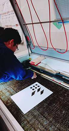 規定条件や実現性を考慮しつつ、費用をかけずに機体性能を向上させるため、素材や加工法について検討を重ねてきました。その結果、レーザー加工機を利用し、製作した部材を組み合わせ、その後機体全体の形を整えるという流れで製作を行っています。また、いくつかの異なる構造の機体を製作し、打上試験の状況も鑑みながら大会出場用機体を決定していきます。