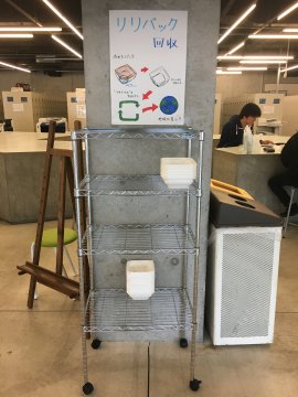 | 回収方法 | 八王子キャンパスの以下2カ所に弁当容器回収ラックを配置し、 生協学生委員会が回収を促す。 ①18号館1階生協店舗前のゴミ箱横 ②18号館2階食堂下膳口の横 |