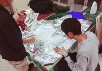 これまでも機体の軽量化のために機体素材を工夫してきましたが、今回は選んだ素材の耐熱性をより実践的に確かめるため、技術指導員の先生にご同伴いただき耐熱試験を行いました。その結果、機体の耐熱性に問題点が見つかったため、耐熱性を向上させる加工をさらに行いました。再度試験を行ったところ、耐熱性が大幅に向上されていることを確認できました。