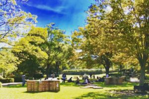 公園の奥にあるひらけた空間には、パレットを使った机や椅子で飲食スペースを作りました。当日は多くの方がこの飲食スペースを使ってイベントを楽しむ姿が見られました。また、子どもたちはチョークでパレットにお絵かきをしたりして楽しんでいました。