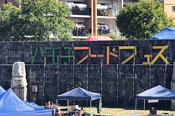 公園に入る時に見える壁には「八王子フードフェス」という大きな文字の看板を作りました。横から見ると文字が崩れて見えますが、正面から見ると八王子フードフェスの文字がきれいに浮かび上がってきます。通りがかった人が思わず立ち寄ってみたくなるような看板ができました。