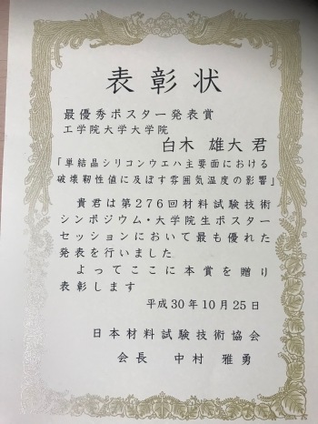 2018年10月25日に開催された2018年度日本材料試験技術協会 第276回 材料試験技術シンポジウムにおいて、機械工学専攻1年(材料力学研究室)白木 雄大さんが「単結晶シリコンウエハ主要面における破壊靭性値に及ぼす雰囲気温度の影響」と題する研究発表で、2018年日本材料試験技術協会 最優秀ポスター発表賞を受賞しました。