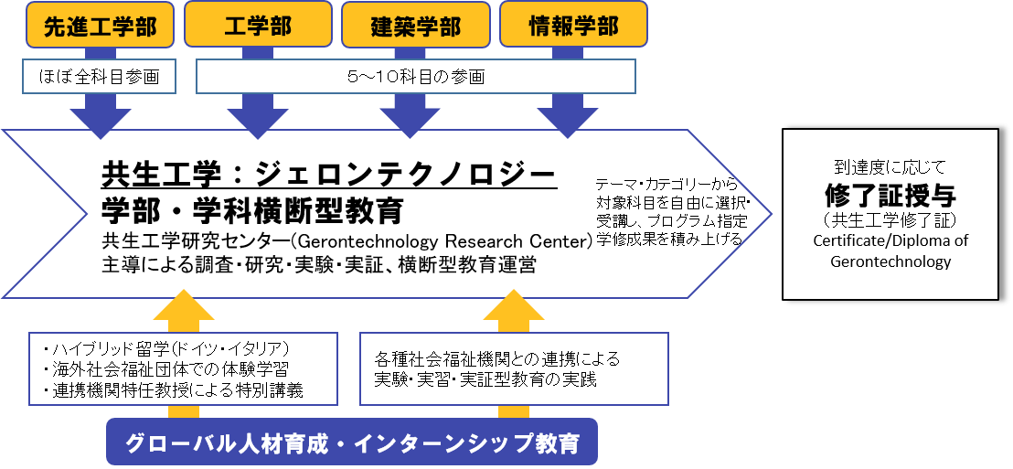 - 各学部が既存の科目からプログラムに適した科目を提示(聴講許可)し、横断型教育プログラムを構成します。学生は、学修テーマ・カテゴリーから履修科目を自由に選択・受講し、プログラム指定学修成果を積み上げます。その到達度に応じて、ジェロンテクノロジストとしての修了証(CertificateやDiplomaなど)が授与されます。