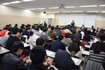 12/8(土)、新宿キャンパスA0712教室にて、工学院大学教師会設立記念シンポジウム「工学院大学から、教師になる—教職のリアル—」を開催しました。「工学院大学教師会」は、卒業生教員から“交流の場を作って欲しい”との声に応えての設立で、会場には現役の先生方や教師経験のある卒業生も多く駆けつけてくださいました。教職課程を受講中の学生も加わって約150名が集まる中、まず全体シンポジウムが始まりました。