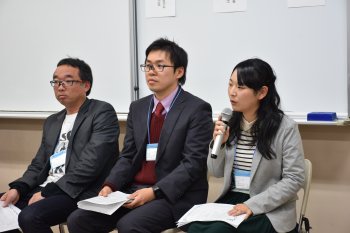 全体シンポジウムでは、卒業生の現役教師3名が、学校で心がけていることや生徒の様子などを語ってくださいました。ふだんはあまり聞くことができない中学・高校の先生方の生活に、大きくうなずく姿やメモを取る学生の姿が見られました。