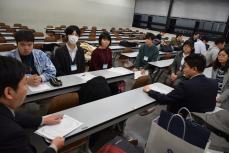 続いて、会場を移して、教科別シンポジウムが開催されました。教科毎に分かれた各教室では、交流しやすいようにさらに2-5グループに分け、学部4年生が各グループでファシリテーターとして交流を進めました。学生から「自分は普通科高校を卒業したので、総合学科や工業科の様子がわからない。それぞれどのような特徴が有るか?」との質問に、卒業生が丁寧に説明するなど、やる気に満ちたやりとりが全グループで行われていました。