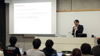 まず最初の講演は、「これからのリーダーとは」についての講演でした。リーダーシップの定義や信頼の必要性、どのようにチームに所属するメンバーの意識を変えるのか、それぞれリーダーに必要な力を具体的な事例を取り入れ、詳細に説明いただきました。講演会の参加者はプロジェクトの代表者にあたる学生が多く、自信の今後に活かすべく、真剣に講義を聴講していました。質疑応答でも、いかに自分が学生団体を先導していけるか、疑問を投げかけ、講師の方はそれに対し、分かりやすく学生の目線に立って解説をしてくださりました。