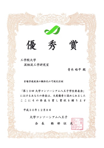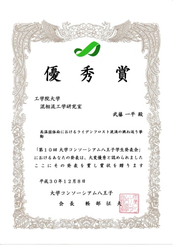 2018年12月8日に東京都八王子市の学園都市センターで開催された第10回大学コンソーシアム八王子学生発表会において、本学機械工学専攻の武藤一平さん・青木皓平さんが、優秀賞・口頭発表優秀賞をそれぞれ受賞しました。