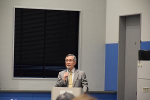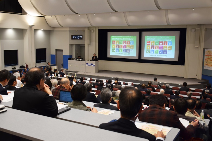 佐藤光史学長の開会挨拶では、国連サミットが掲げる「SDGs」(持続可能な開発目標)や日本の超高齢社会の現状について紹介があり、この4月から試行される学部・学科横断型教育・研究の意義について説明がありました。
