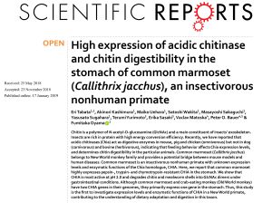 食虫性非ヒト霊長類,コモンマーモセット (Callithrix jacchus) の胃における,酸性キチナーゼの高い発現とキチンの消化性