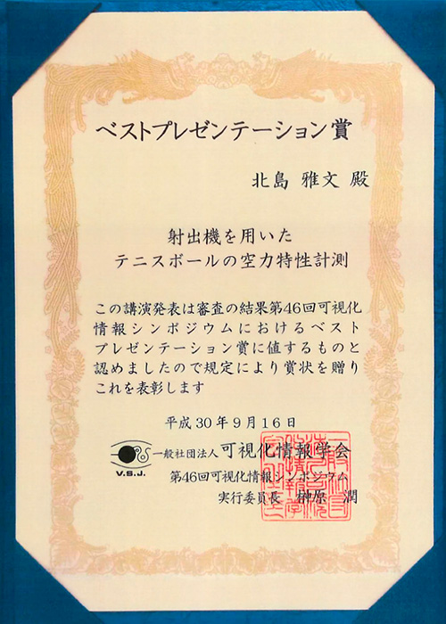 研究テーマは、射出機を用いたテニスボールの空力特性計測。日本全国から集まった大学生の中から、厳正な審査のもとにベストプレゼンテーション賞が授与されました。