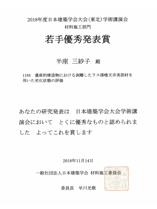 建築学専攻修士課程1年の半座三紗子さん(指導教員:田村雅紀教授)が、2018年度日本建築学会大会(東北)学術講演会材料施工部門において、若手優秀発表賞を受賞しました。研究題目は、「遺産的建造物における剥離したラス漆喰天井実部材を用いた劣化状態の評価」。