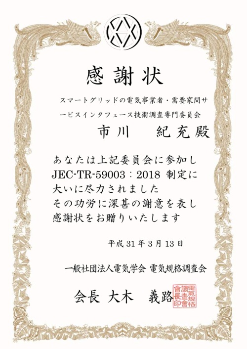 市川紀充准教授(電気電子工学科)が委員として参加した、電気学会 スマートグリッドの電気事業者・需要家間サービスインターフェース技術調査専門委員会(2016年10月15日~2018年9月30日)の活動の成果として、「JEC-TR-59003:2018 非常用発電機システムによるエネルギーサービスに関する標準仕様」のJEC-TR制定に対し、電気学会電気規格調査会から感謝状を頂きました。