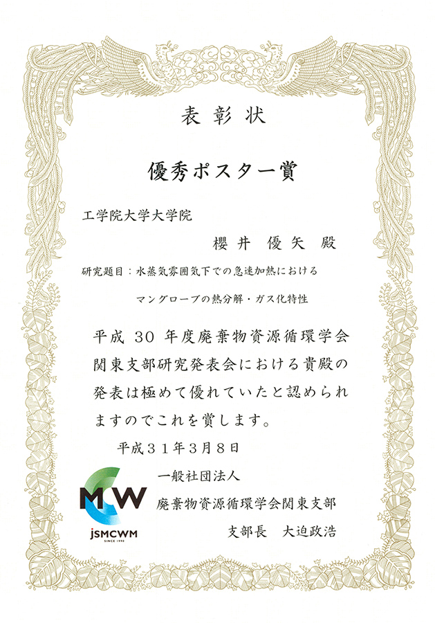 2019年(平成31年)3月8日に工学院大学新宿キャンパスで開催された平成30年度廃棄物資源循環学会関東支部講演会・研究発表会において、機械工学専攻修士課程1年の櫻井優矢さん(リサイクル工学研究室・小林潤准教授)が優秀ポスター賞を受賞しました。