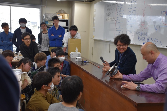 この授業では、フォスター電機株式会社 フォステクス・カンパニーから現役の技術者の方々を講師としてお招きし、キットの組み立ての実演を交えながら、スピーカーの構造と音の出る仕組みについて教えていただきました。新入生にとって、現場の第一線で活躍する技術者の方々と触れ合う貴重な機会にもなりました。
