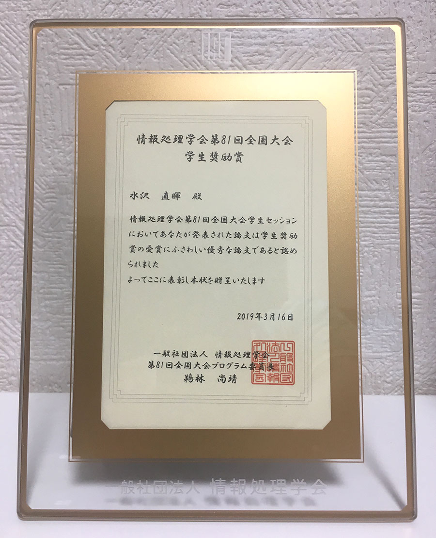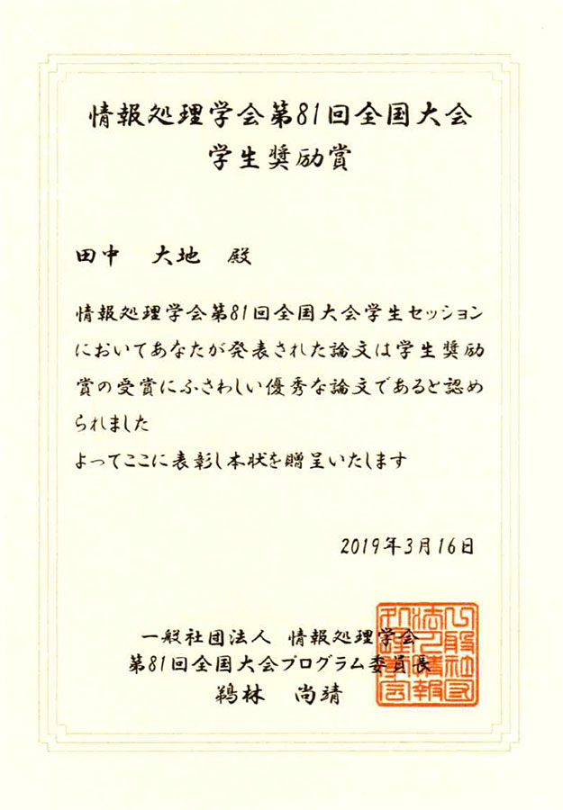 2019年(平成31年)3月14日~16日に福岡大学七隈キャンパスで開催された情報処理学会第81回全国大会において、電気・電子工学専攻の水沢直暉さん・佐藤悠祐さん(ネットワークコンピューティング研究室・山口実靖准教授)、情報学部コンピュータ科学科の小野祐央さん(高信頼ソフトウェア開発工学研究室・位野木万里教授)、田中大地さん(経営情報システム研究室・三木良雄教授)の4名が学生奨励賞を受賞しました。