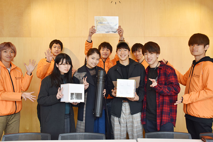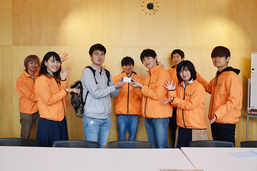 授賞式では主催者である新歓実行委員会の学生さんが、クオカードやコーガくんぬいぐるみなどの賞品を受賞者のみなさんに渡し、お祝いしました。