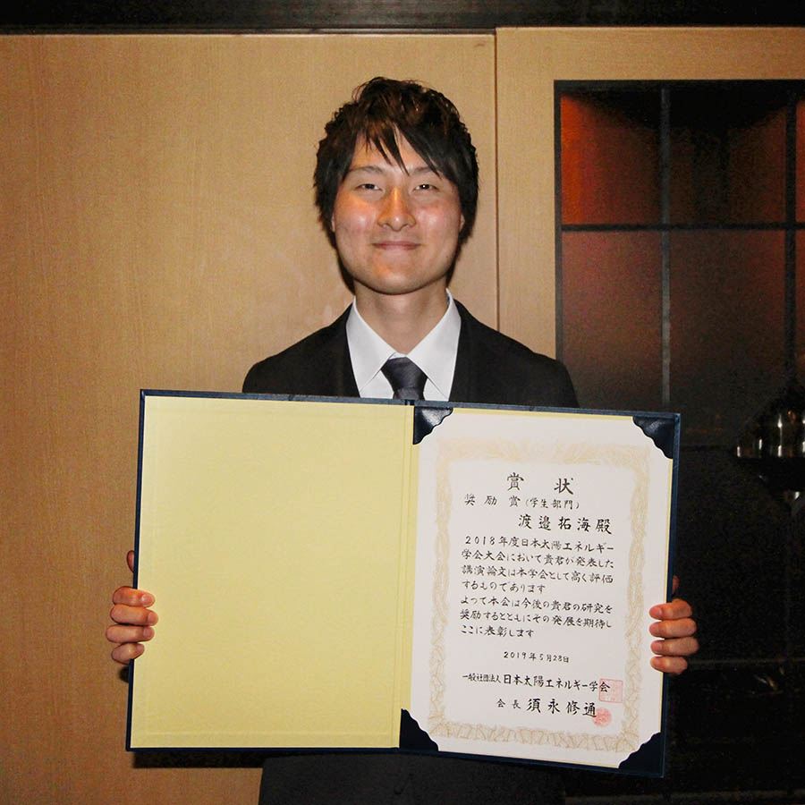 2018年11月9日に島根県松江市・くにびきメッセで開催された日本太陽エネルギー学会において、建築学部まちづくり学科(当時4年)の渡邉拓海さん(西川研究室・西川豊宏教授)が奨励賞(学生部門)を受賞し、2019年5月28日の同学年定時社員総会にて表彰されました。