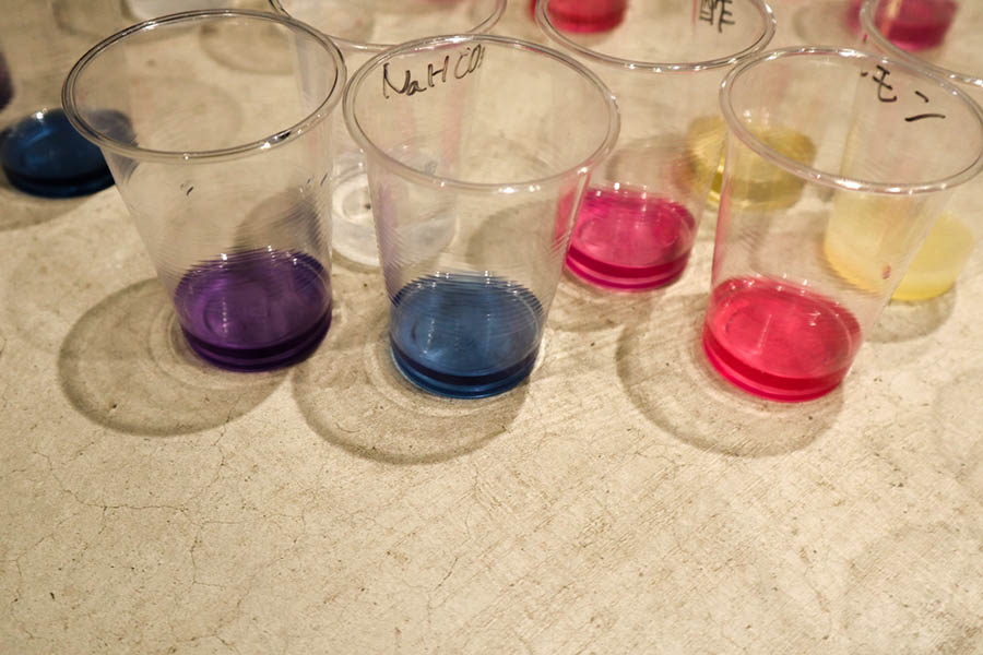 はじめに、PowerPointで作り方や簡単な理論を説明しました。続いて実際に作ってみることで、科学に触れてもらいました。ダイラタンシーでは、「固まったり、液体になったり面白い」といった感想をもらいました。紫キャベツでは身近にあるものの酸性、アルカリ性を調べました。反応させる液体によって色が違うため、色がついた液を不思議そうに見ていました。