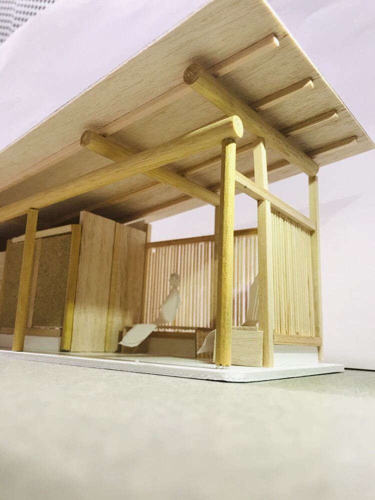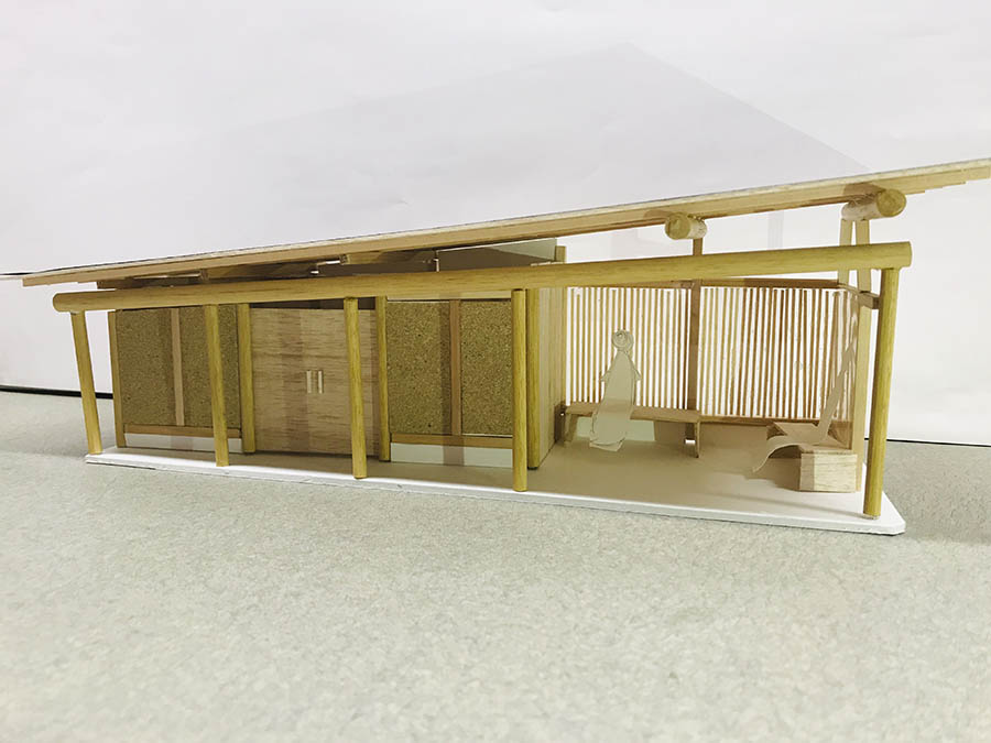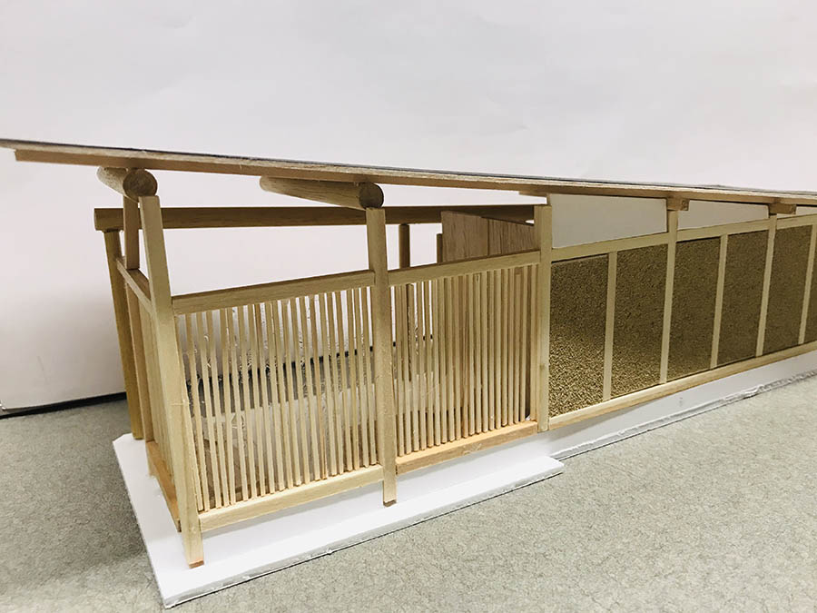 プロジェクトにご協力いただいている結設計室の関谷様の力をお借りして図面を作成し、8月初旬には学生たちの手で、倉庫の模型を完成させました。 今回の倉庫には、利用者が居心地よく利用できるようルーバーを取り入れた休憩スペースを設置する予定です。ほどよく日差しが当たる心地よい空間になるよう、デザインにこだわりました。