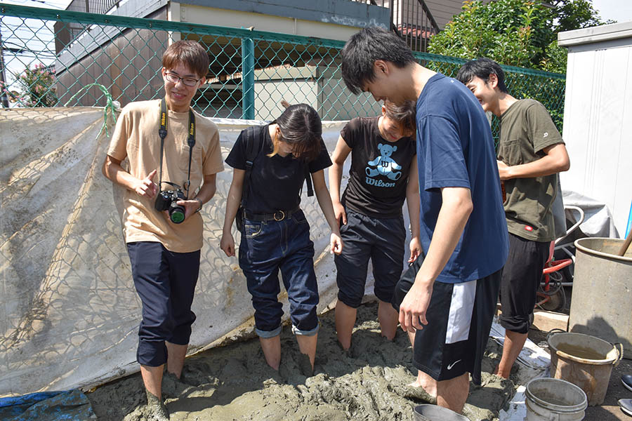 9月2日には、倉庫の上棟を行い、地元の宮大工さんが、次々と倉庫の基礎を完成させていく姿を、学生たちが見学しました。今回完成した骨組みは、日本の伝統的な木構造が採用されており、釘や接着剤は使わずに木材を組んで作られています。同日に、倉庫に塗る土壁の土を練り返す作業も体験しました。