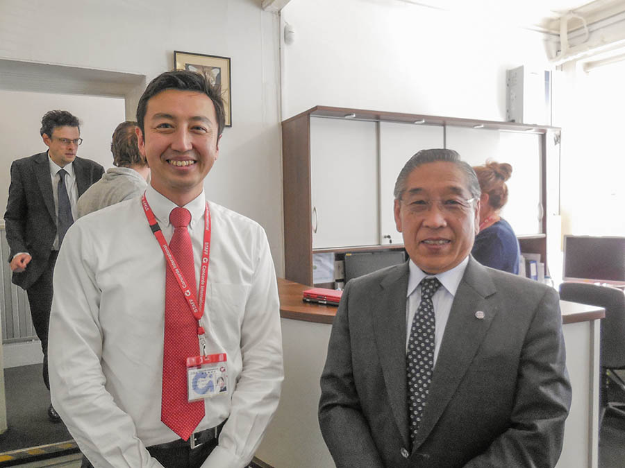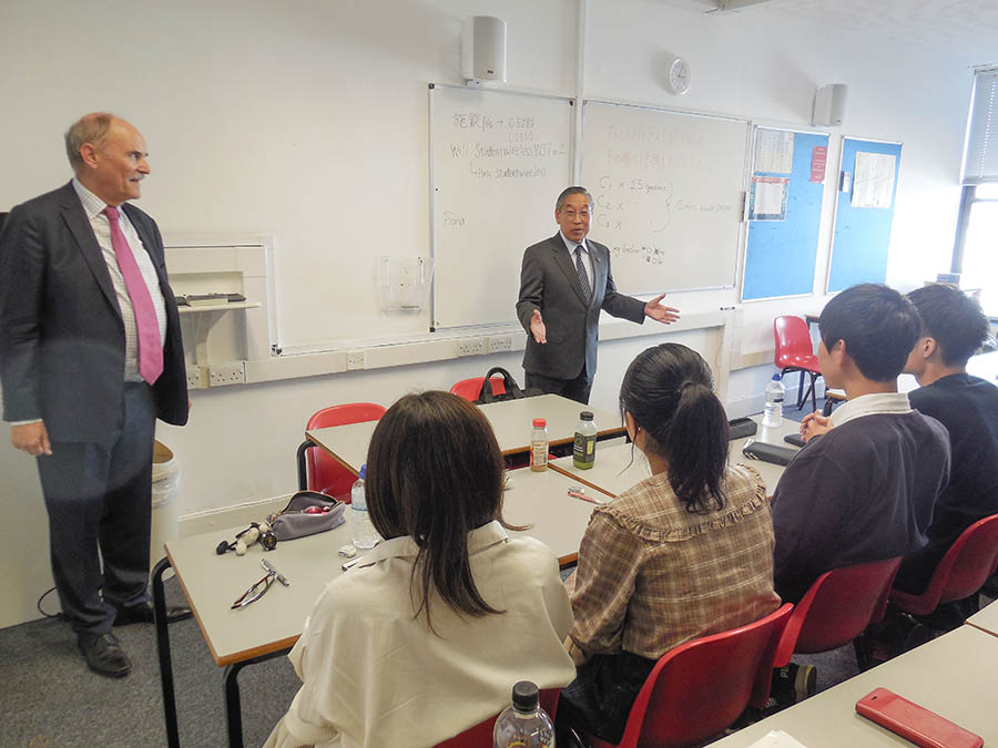 学校校舎の見学後、協定書更新のための調印式では、コンコルド・インターナショナルのコリン・ストーン校長が出迎え、和やかなムードの中佐藤学長とストーン校長がそれぞれ協定書に署名しました。