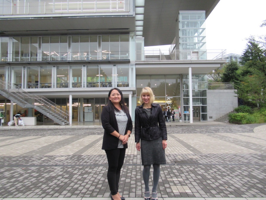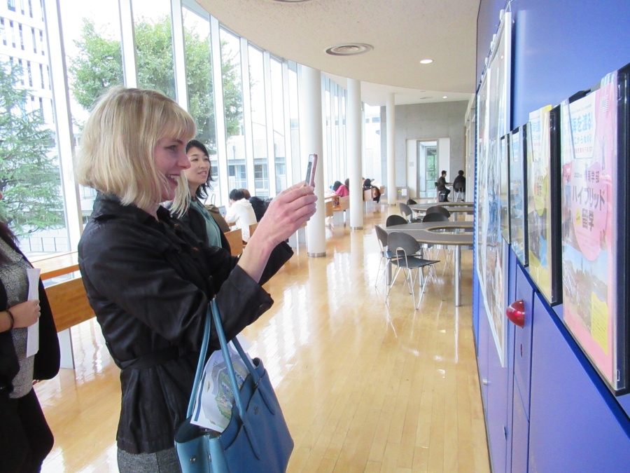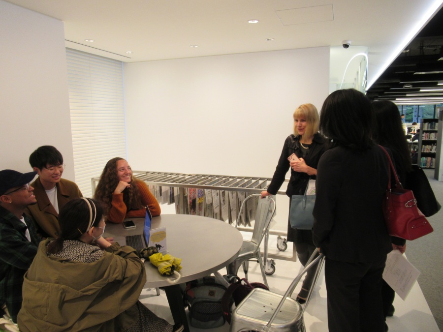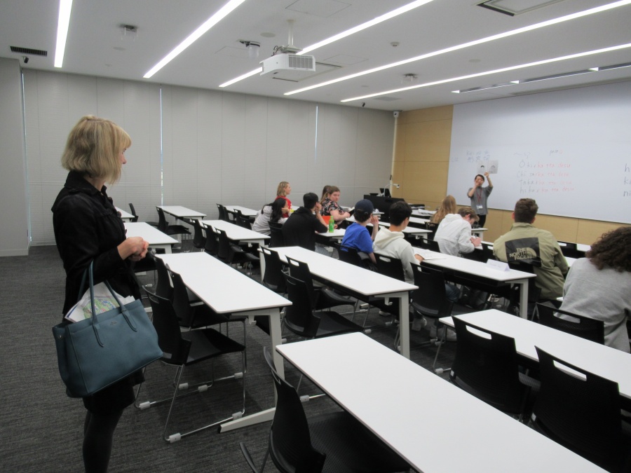まずは八王子キャンパスを訪問し、各施設の見学を行いました。また、現在本学で実施中である協定校Green River College(GRC)の日本留学プログラムも一部見学し、実際に留学中の協定校GRC学生やハイブリッド留学経験者とAnne国際部長が交流を行う場面もありました。