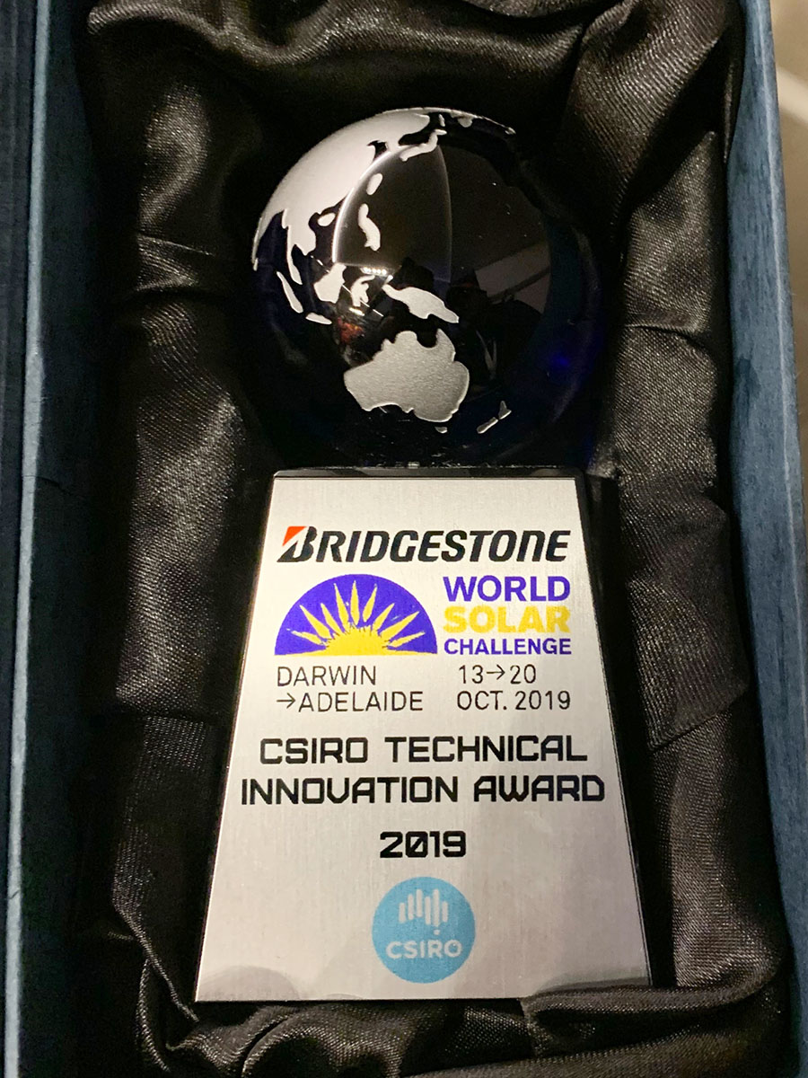 さらに、10月20日に開催された授賞式では、優れた技術を持った車両に贈られる、オーストラリア教育科学訓練省所管の研究開発機関であるCSIRO公認の技術賞「テクニカルイノベーションアワード」を受賞しました。「ハイドロニューマチック・サスペンション」を世界で初めてソーラーカーに取り入れた業績が評価されました。このサスペンションは、空気性能を向上させるため、学生達が一から設計・製作しました。