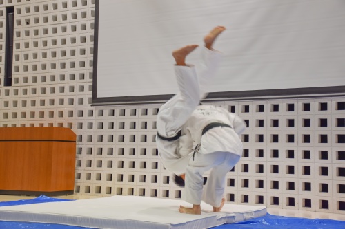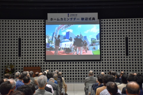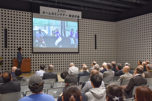 その後、ソーラーチームの学生が撮影、編集した映像が上映されました。柔道部より技の披露、新聞会から活動報告と新聞会、野球部、サッカー部、アメフト部のPR動画が上映されました。