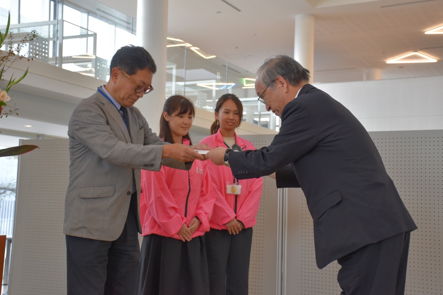 14時から始まった、食堂での懇親会では、校友会会長田野邊幸裕会長より、みつばちプロジェクト、サイエンスクリエイトプロジェクトの学生への支援として、植樹が行われたことを記念し、目録の贈呈が行われました。