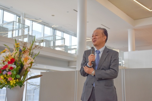懇親会では、玉川 雅之常務理事がご挨拶をされました。本学では卒業生が在籍する企業を進路として選ぶ学生が多いことに触れ、卒業生に対し感謝の言葉を述べられました。